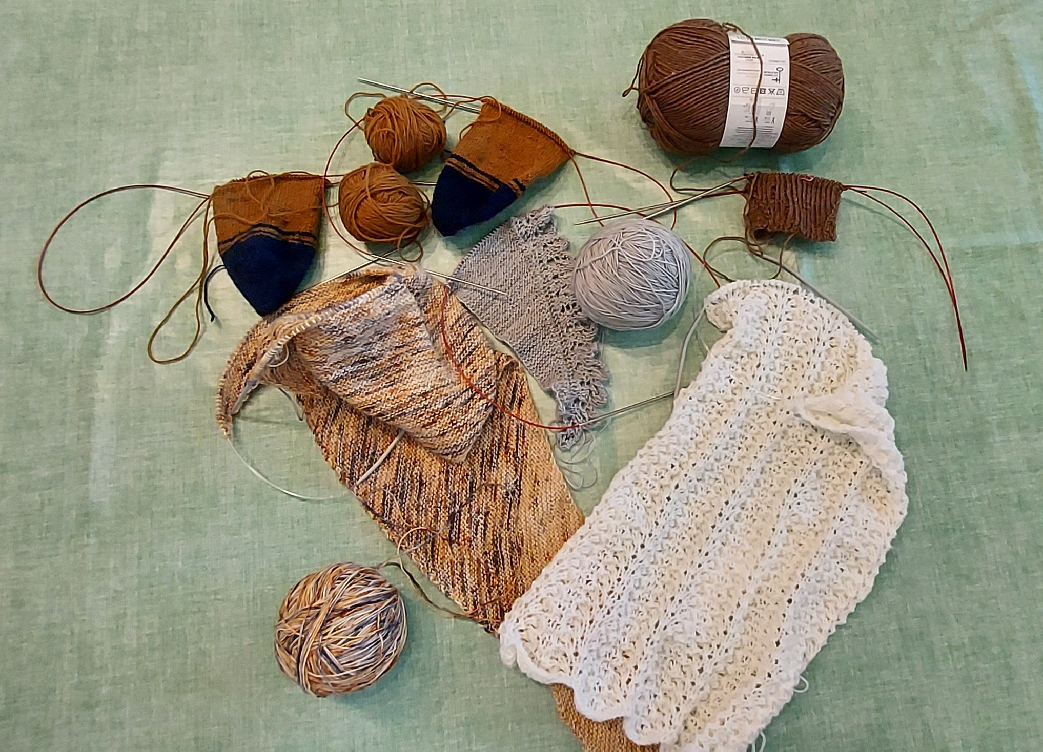 Nyt juuri olen neulomassa Stay Soft -huivia, kellertävä hökötys tuossa keskellä. Olisi menossa myöhästyneeksi synttärilahjaksi. Pyrin siis samaan valmiiksi ensi tilassa.